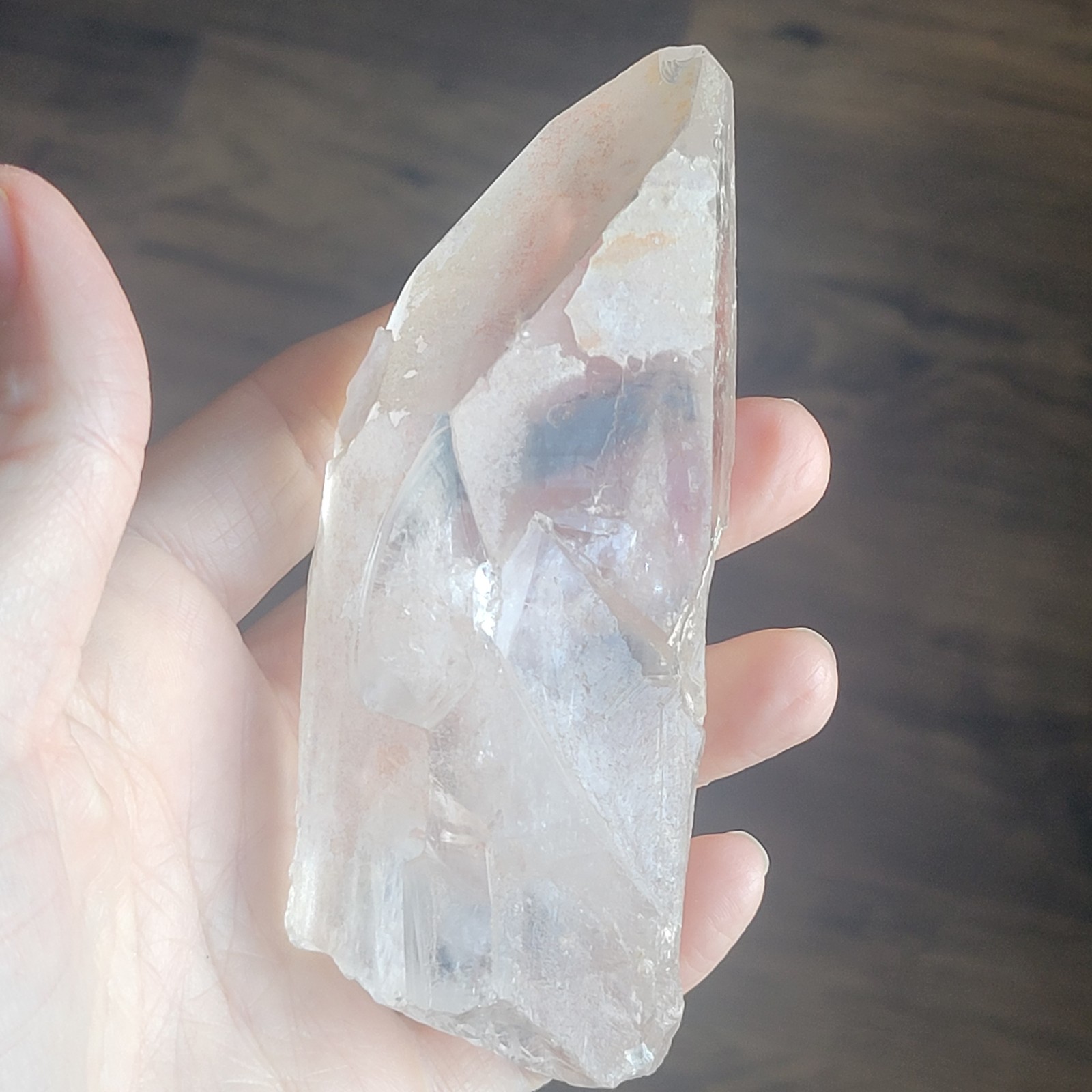 Here's an older find, a scarlet temple lemurian quartz! It has a softer color from hemetite and iron inclusions. There are keys, rainbows, and it is empathic. Some areas have an orange hue as well. It holds light very well, and it makes a very slight singing pitch when tapped. I mean very slight, but it is noticeable. It feels like a great crystal for transmuting energy, and bringing out the light in situations, areas, or the aura.