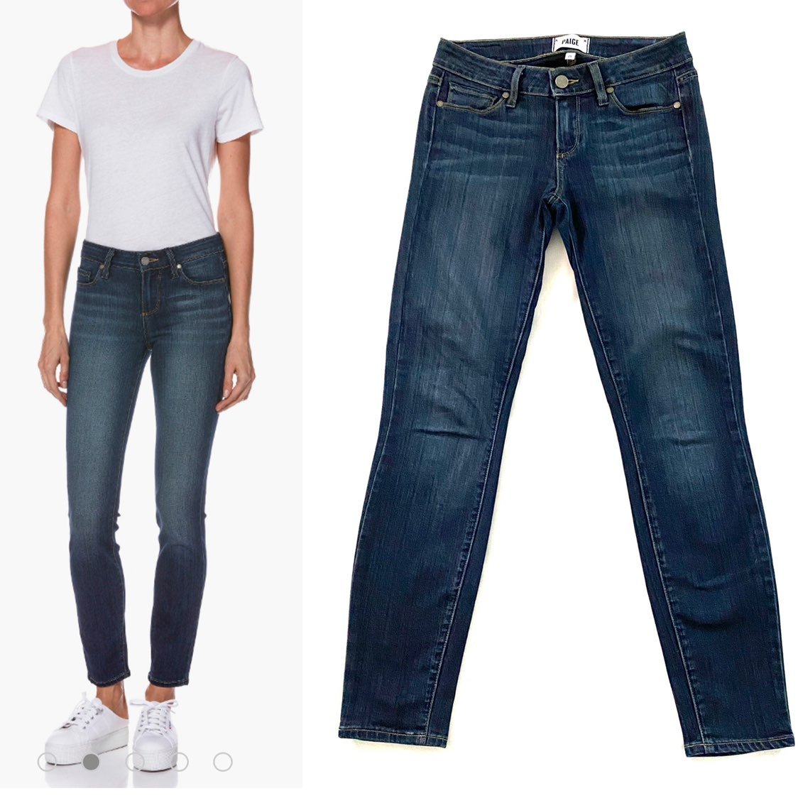 Paige Verdugo Ankle Skinny Jeans, size 26. Only worn once, no flaws. Stretch skinny ankle, 5 pocket styling. Dark wash with some subtle fade/whiskering. 28in inseam, 8in mid rise, waist laid flat is 14in across. I’m a 26 in most jeans and these fit true to size in my opinion.