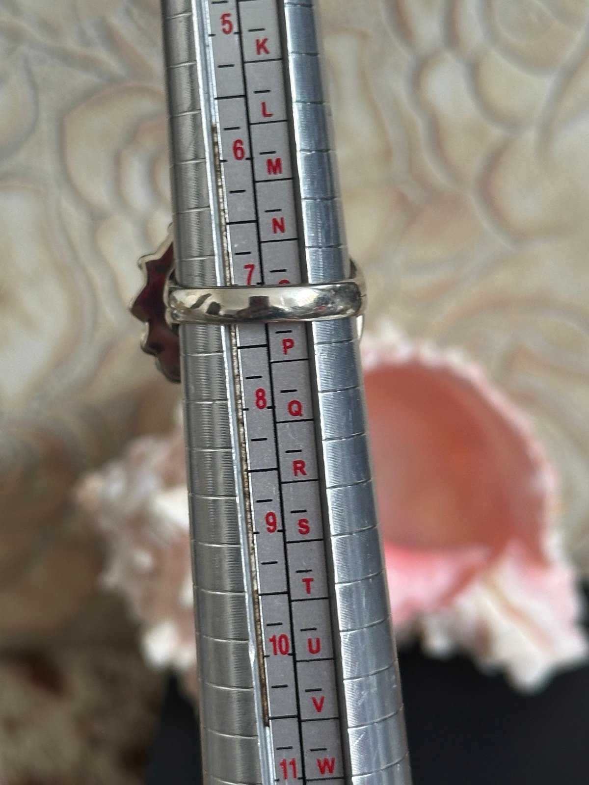 Beautiful teardrop, genuine, pink conch shell ring. This particular pink conch shell stone in this ring is extremely beautiful. Great coloration. The setting on this ring is southwestern beauty. With an accent turquoise stone.