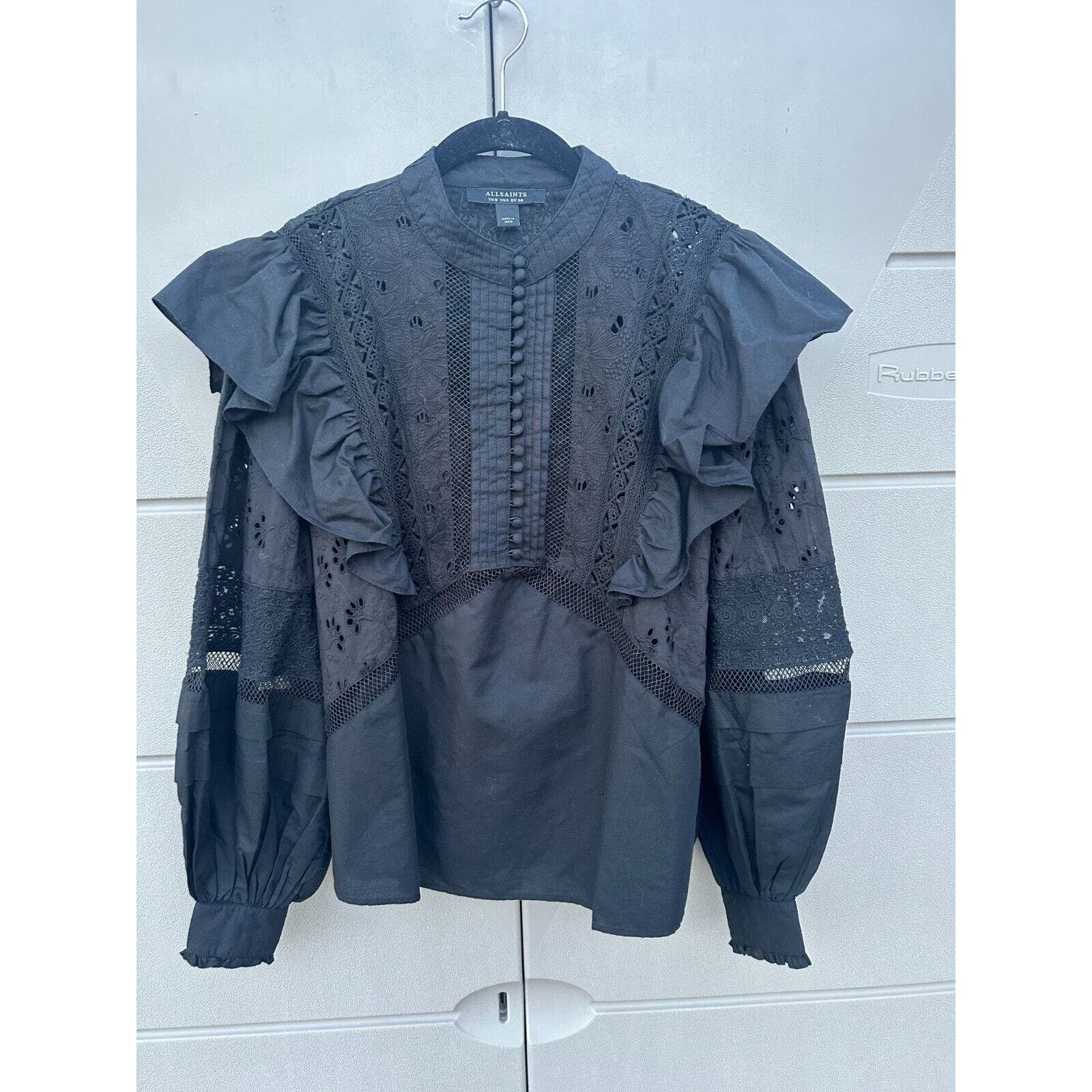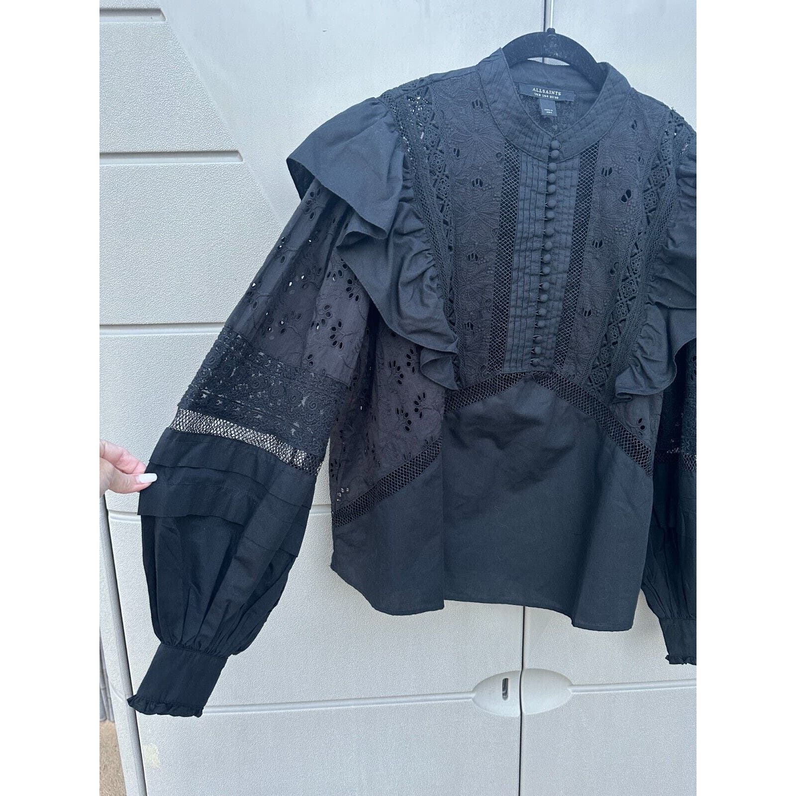 AllSaints Black Prim Broderie Eyelet Ruffled Bubble Sleeves Top Size 4