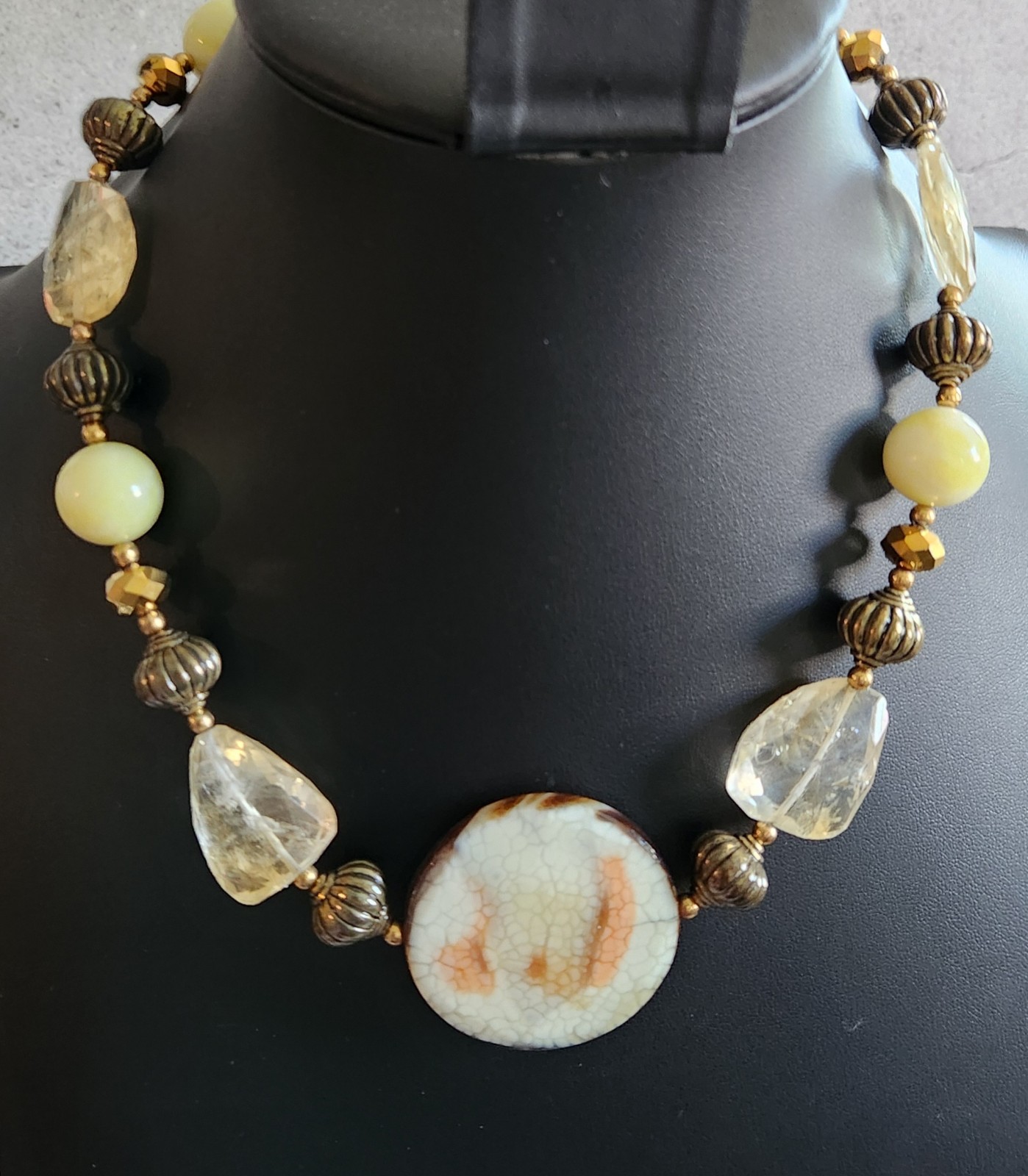 This vintage Tibetan agate slice citrine beaded necklace features a round pendant with a multicolored main stone and secondary citrine crystal stones. The necklace has a toggle closure and is 18 inches in length. Made in the United States, this original necklace combines gemstones, glass, and crystal materials in a Bohemian and fairytale-themed style.