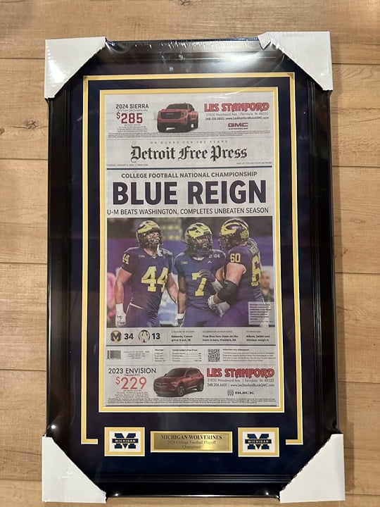 Michigan Wolverines 2024 College Football Playoff Detroit Free Press Newspaper front page Framed with black frame, blue suede over yellow double v formatting, 2 Michigan logos, and gold plaque reading: (1st line: Michigan Wolverines, 2nd line: 2024 College Football Playoff, 3rd line: Champions)