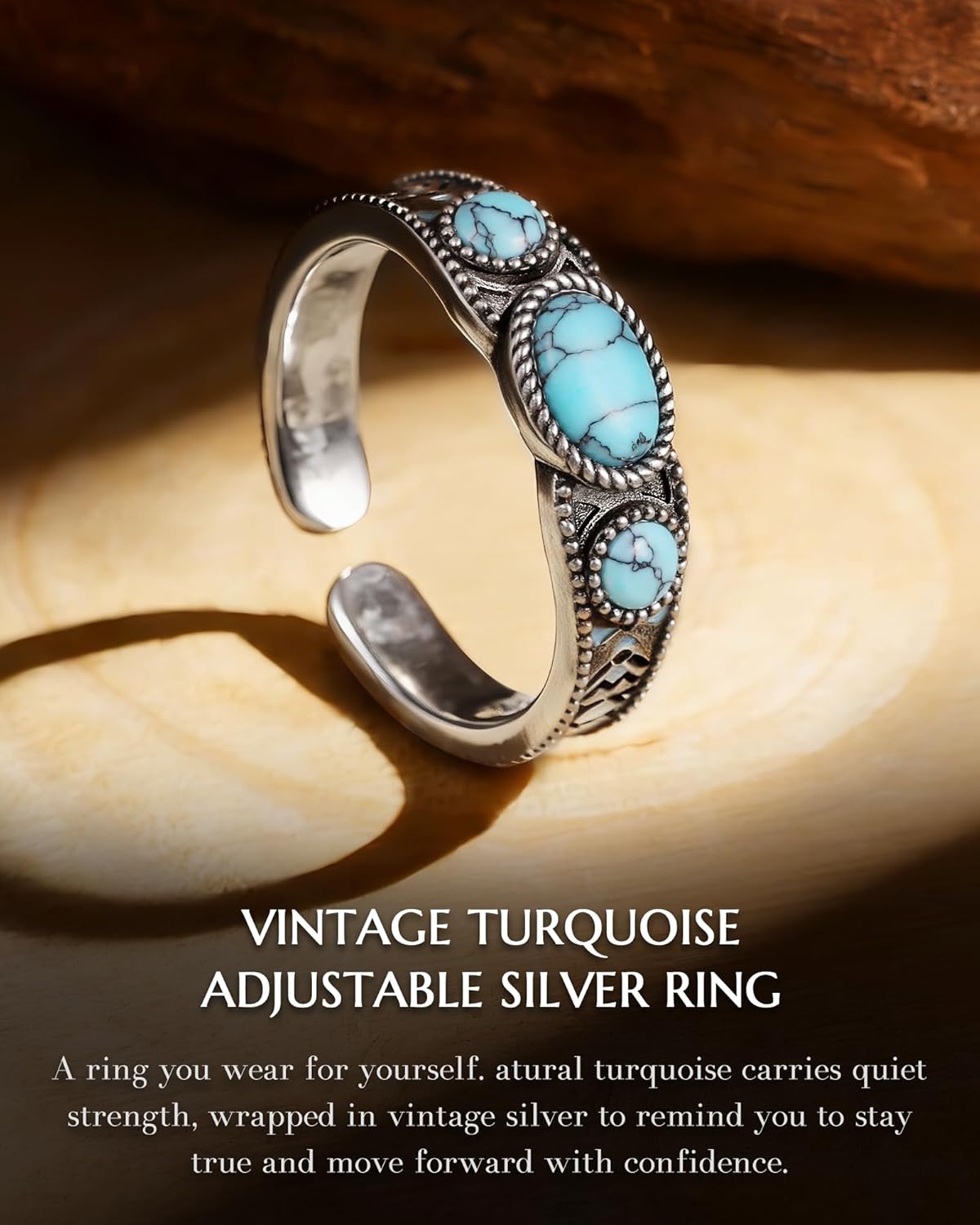 Simple and classic jewelry. Each piece has a story behind it, just like each gift for every life milestone has a story behind it. Story & Cultural Imagery Step into the vast landscapes of the American West, where freedom and open skies inspire the spirit. This turquoise ring embodies that same sense of liberty. Each natural turquoise stone carries its own unique pattern, echoing the wind, earth, and passage of time. The vintage 925 sterling silver details evoke the style of Bohemian travelers—full of stories yet refined, timeless yet fashionable. Wearing Experience & Gift Idea The open band design allows for effortless adjustment, ensuring a comfortable fit for any finger. Whether paired with everyday outfits or holiday attire, this ring stands out with its unique charm. Ideal as a gift for friends, mothers, or yourself, it conveys individuality, freedom, and a connection to natural beauty. Crafted from high-quality 925 sterling silver, it retains its shine and becomes a cherished piece for years to come. Maintenance Instruction Keep your rings in your bag at the end of the day. Do not spray perfume directly on the jewelry. Do not immerse your jewelry in liquid. After wearing the rings, wipe it with a soft flannel cloth before putting them away. Minor tarnish can be lightly buffed off with a jewelry polishing cloth(you can find the cloth in the gift bag) or a mild jewelry cleaner.