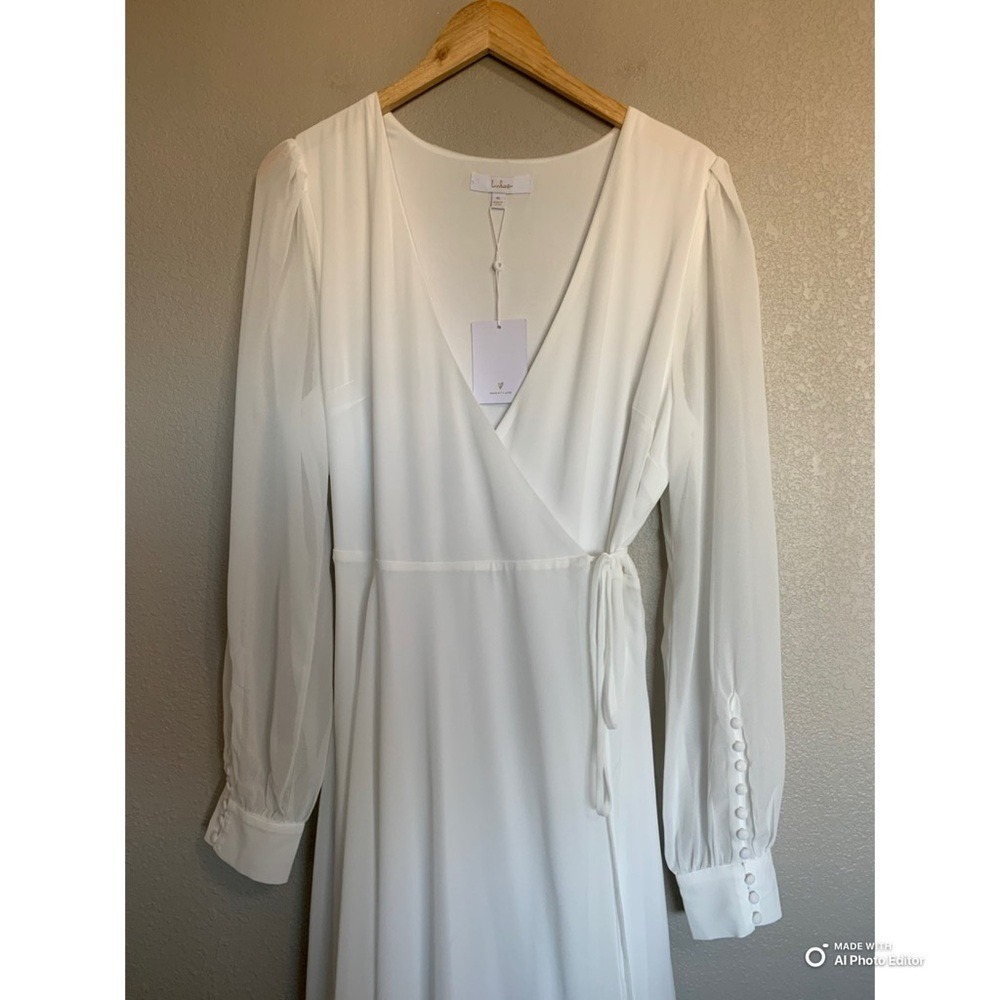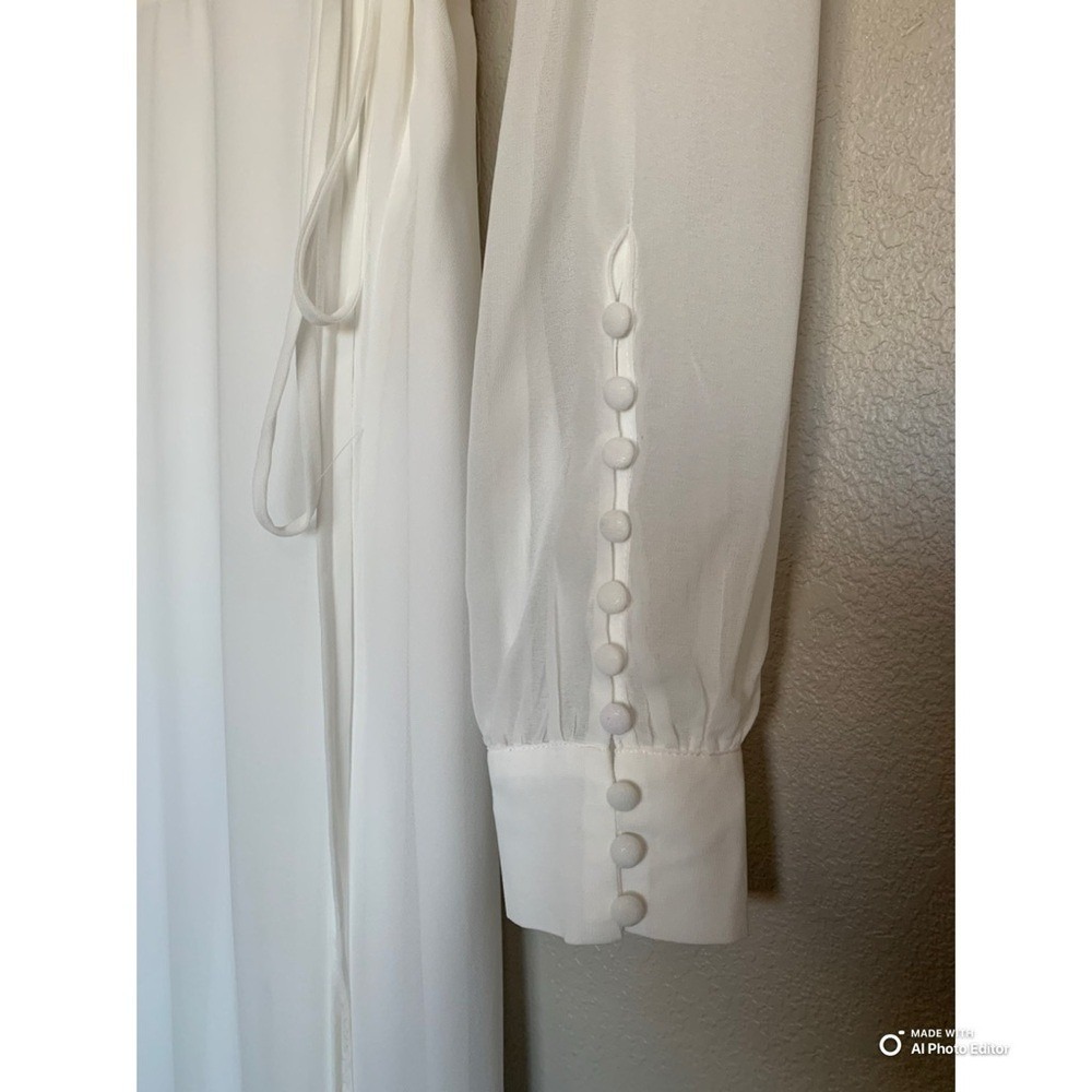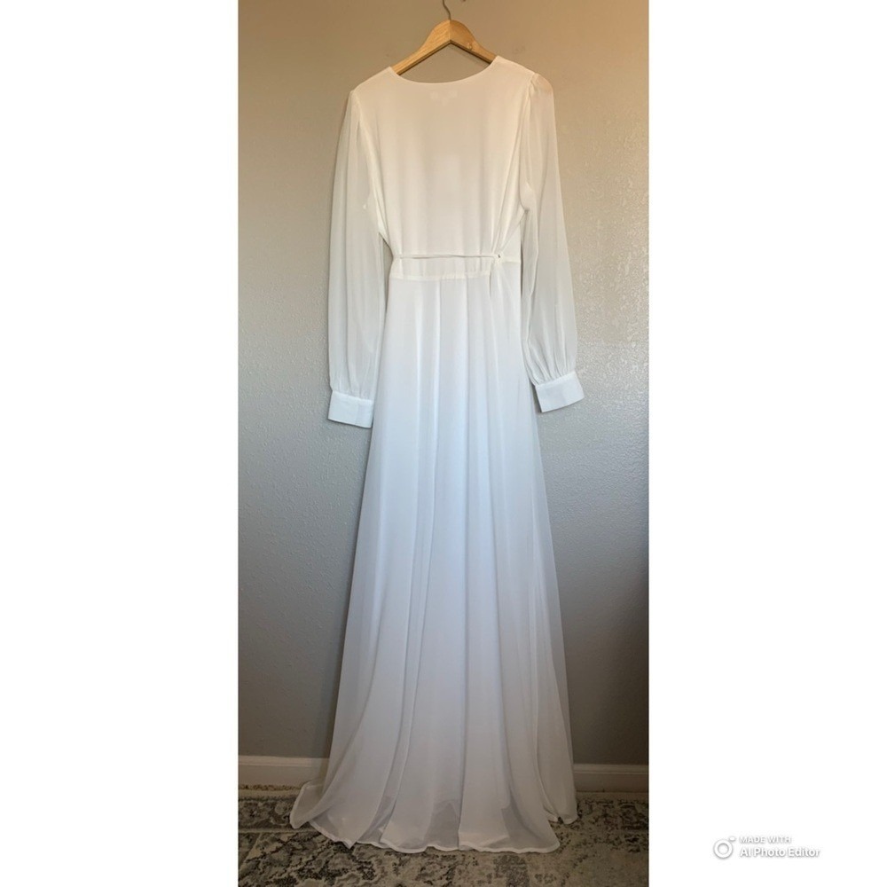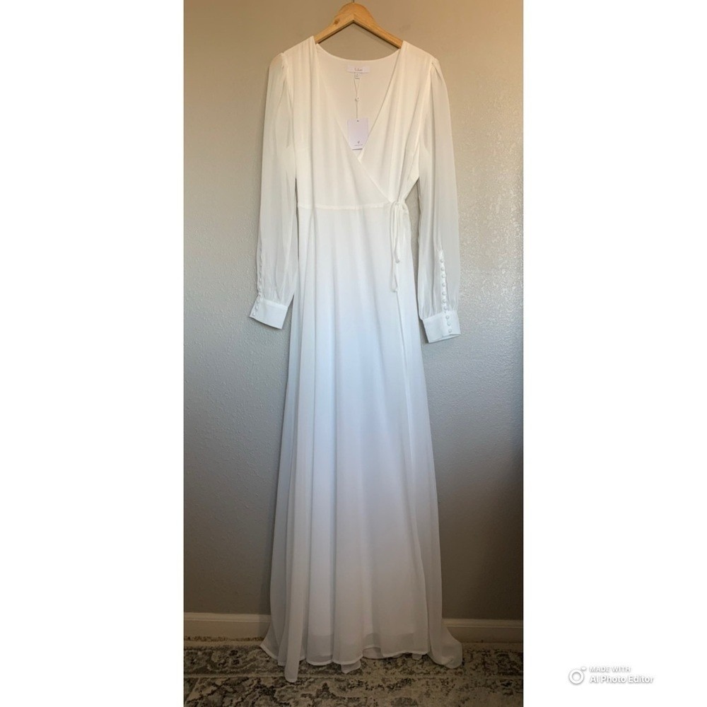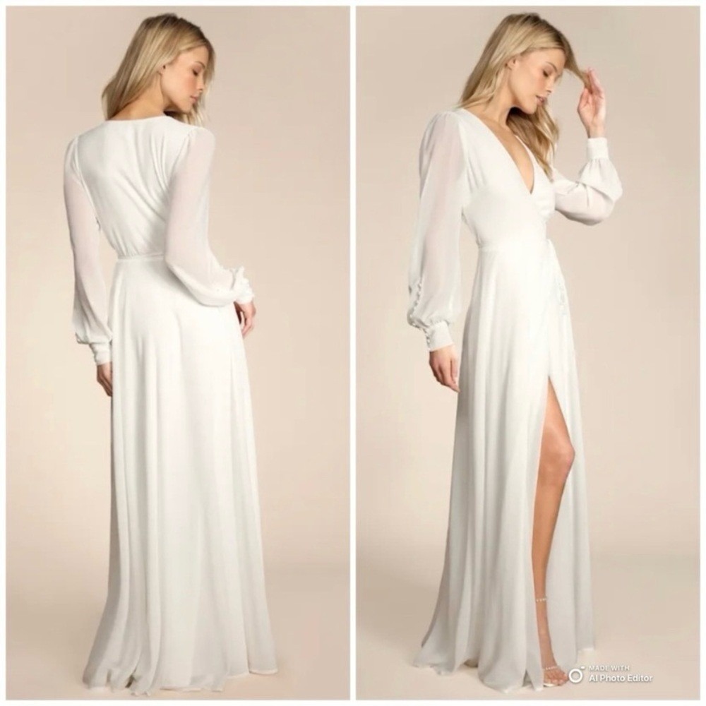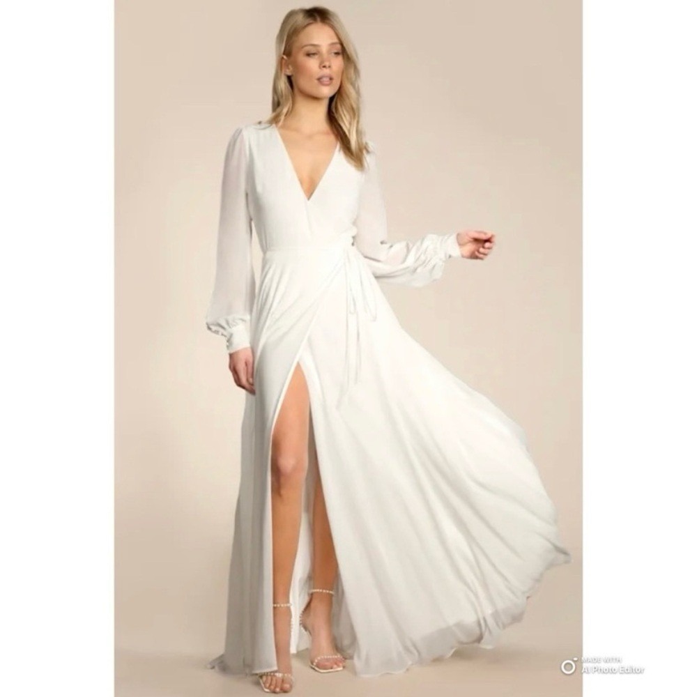 My Whole Heart White Long Sleeve Dress from Lulus. This elegant dress features a true wrap style with waist tie closure, floaty chiffon long sleeves with button detailing, and a maxi length. Bodice and skirt are lined and have a chiffon overlay. Hand wash cold.