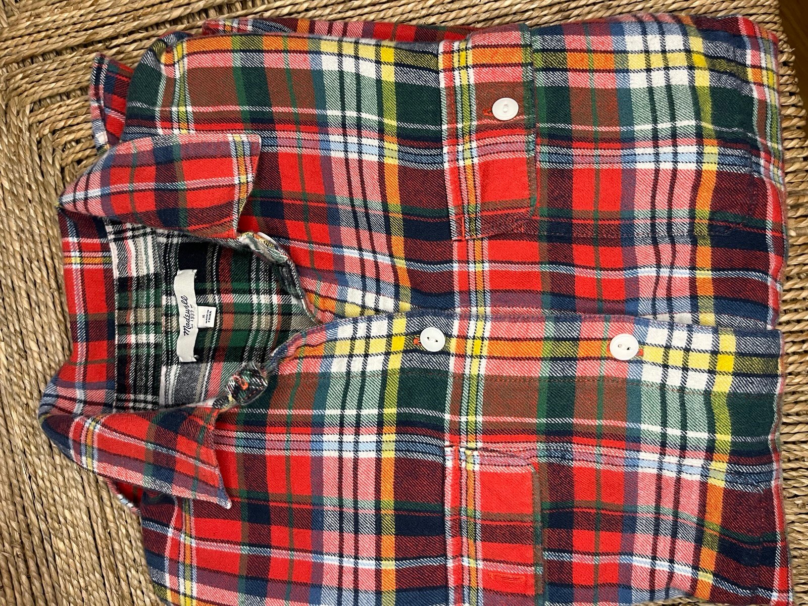 Timeless Madewell flannel shirt featuring a rich red, green, navy, and yellow plaid pattern. Crafted from soft brushed cotton for a cozy, lightweight feel. Designed with a classic button-down front, long sleeves with button cuffs, and dual chest pockets. Effortless casual style perfect for layering in any season.