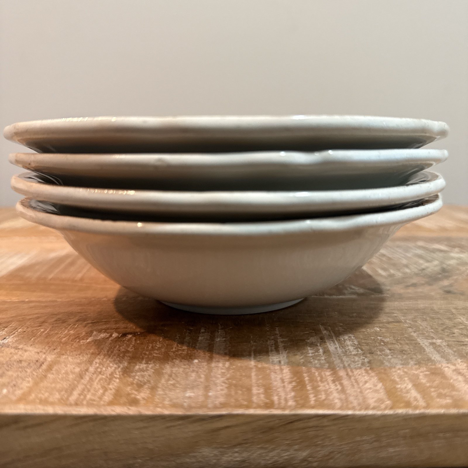Gien Rouen Au Sainfoin France Set of 4 Cereal or Soup bowls. Each bowl measures 6.5" diameter at the top, 2.5" diameter at the base, stands about 1 3/4" tall. The bowls have visible signs of age and wear consistent with vintage condition.There are some scratches and marks both inside and around the rims, some roughness around the base and the rim. The overall finish appears slightly dulled from age and us, adding to their antique charm. Despite their wear, they remain absolutely beautiful, radiating a warm, french country cottage vibe. The soft colors, delicate floral details, and rustic patina make them perfect for adding a touch of timeless elegance to any table or display.
