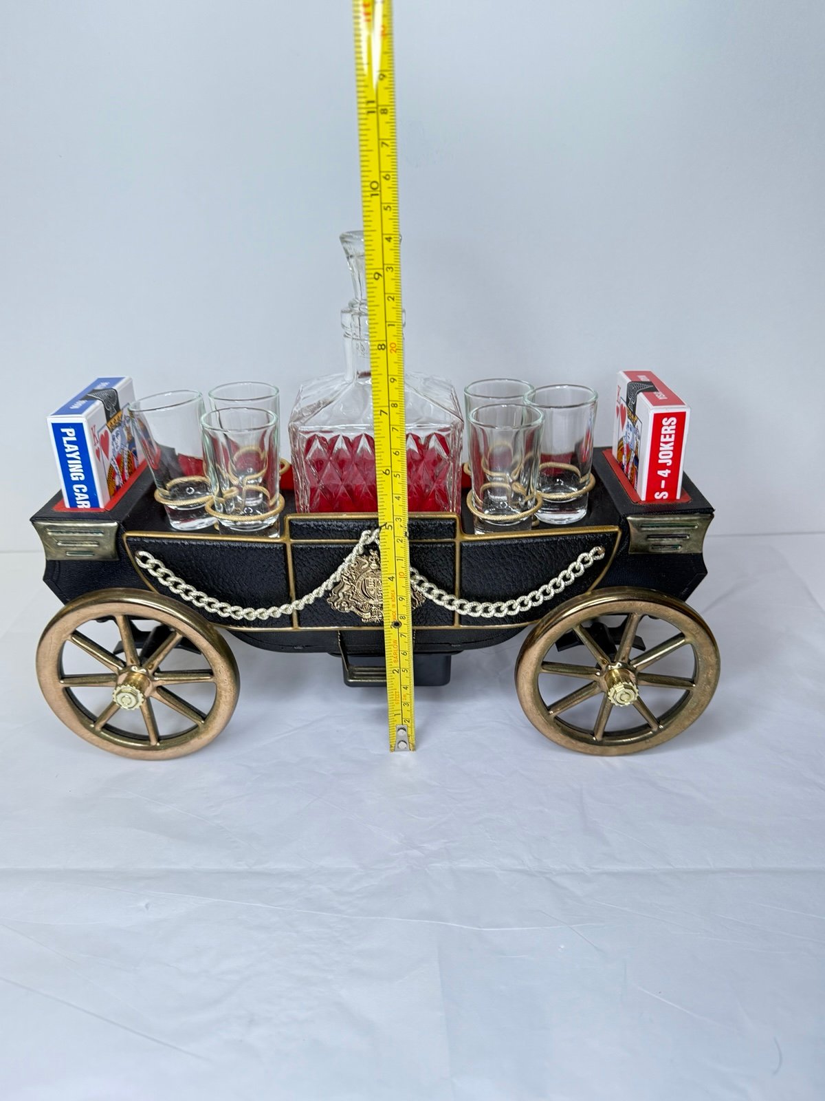 Here's an amazing addition to your vintage barware collection! This vintage coach/carriage will serve your shots in royal style! Carriage rolls easily, and features slots on each end to hold decks of playing cards (I've included two). Plays "Roll Out The Barrel" when you lift out the bottle. Wind- up music box. A great gift for any collector of vintage barware.