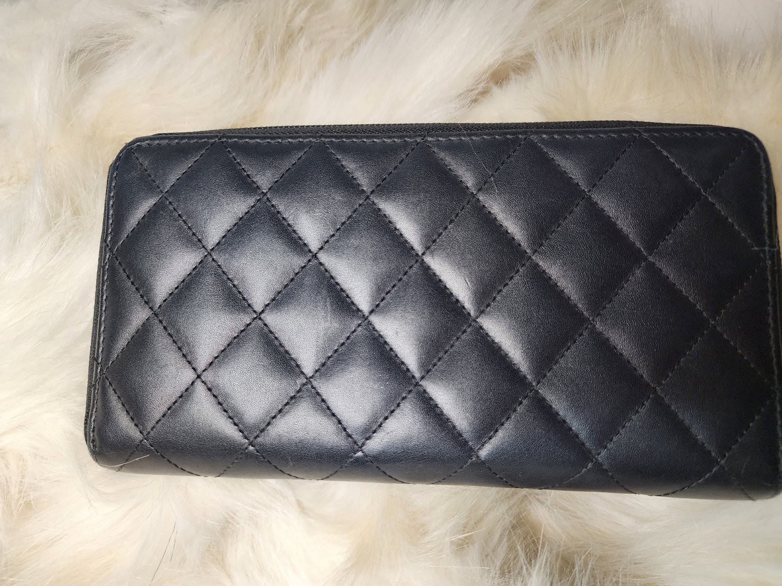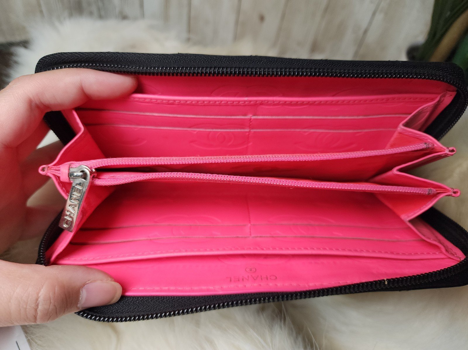 This wallet features a black stitched leather CC, a black quilted leather exterior. Original silver-tone link chain with CHANEL hardware zip-around zipper pull. Leather pink Interior lining with some stains. No rips, no holes. The interior features 1 coin zippered pocket, original silver-tone Chanel zipper pull. Mild imperfections, check photos for details. Overall, the wallet is in good pre-owned condition.
