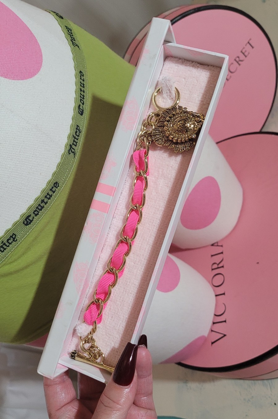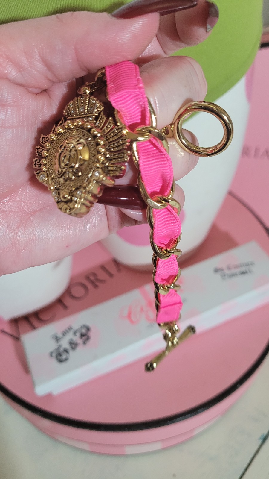 this features a decorative charm with embellished crystals on it with the iconic JC logo in it with Hot Pink intertwined ribbon inside the gold link chains