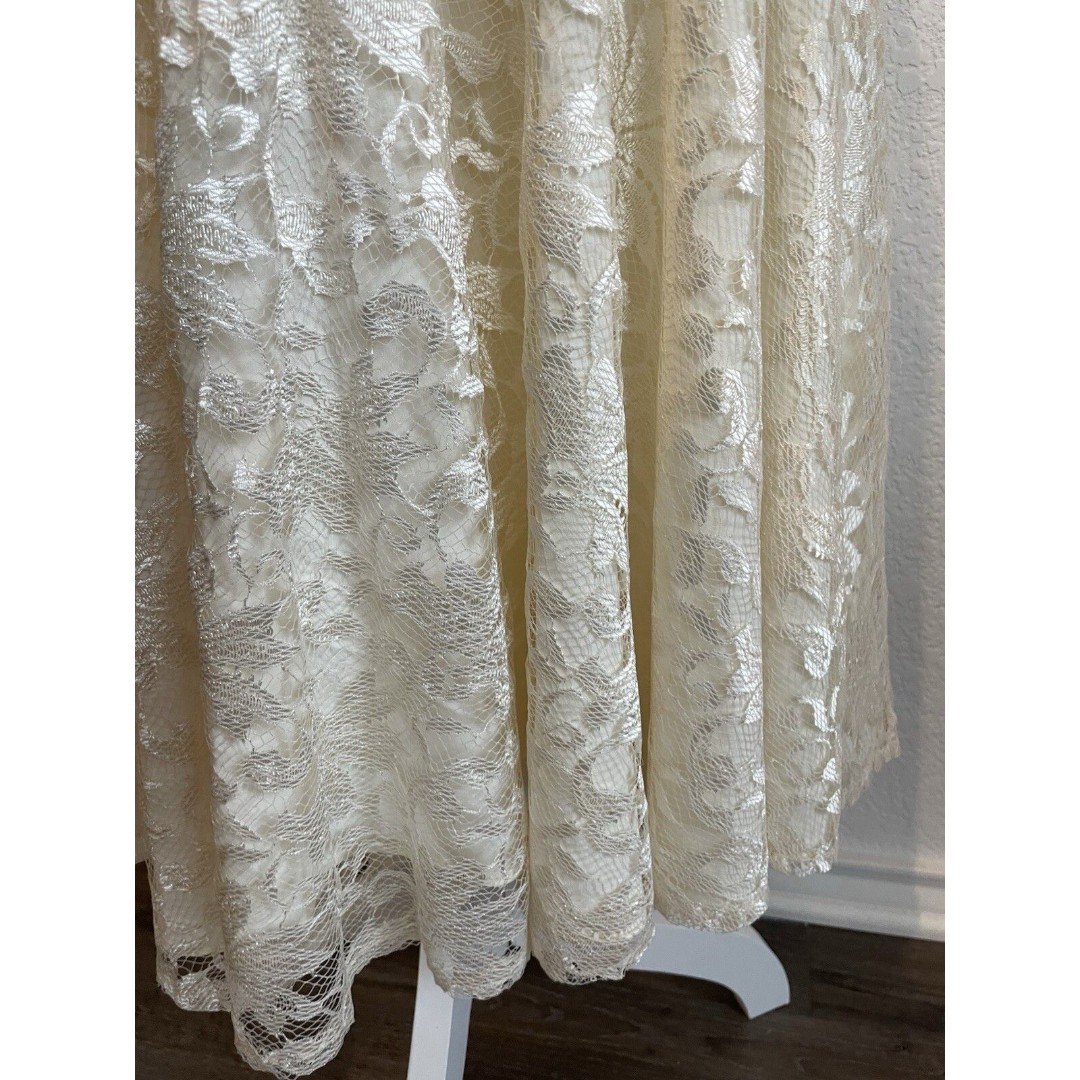 This vintage dress from the 1980s is perfect for any special occasion, especially weddings. The ivory satin fabric is adorned with delicate white lace, creating a timeless and elegant look. Made in the USA, this dress is a true gem for anyone who loves vintage fashion. The dress is in excellent condition and will surely make any woman look stunning.