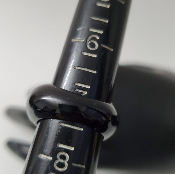 Description: This striking ring makes a bold statement with its sleek, high-gloss black band and a brilliant solitaire diamond simulant. The black material, likely acrylic or resin, has a smooth and rounded shape, creating a substantial and eye-catching design that contrasts beautifully with the sparkling gem. The material’s glossy finish adds a mirror-like sheen, giving the ring a modern and polished appearance.