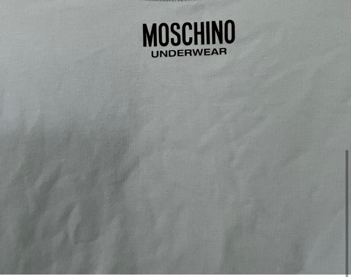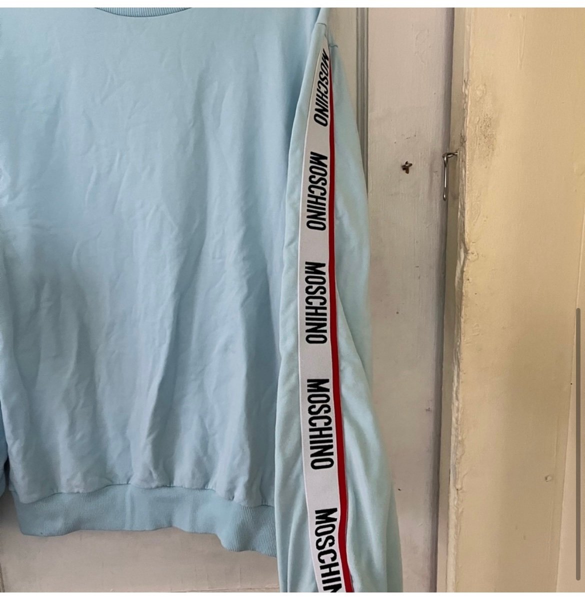 MOSCHINO men’s light blue logo tape arm Crewneck sweatshirt. Moschino underwear on back.