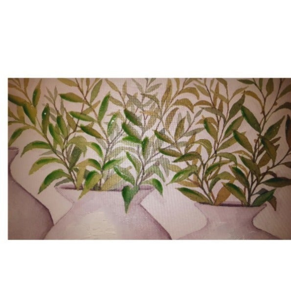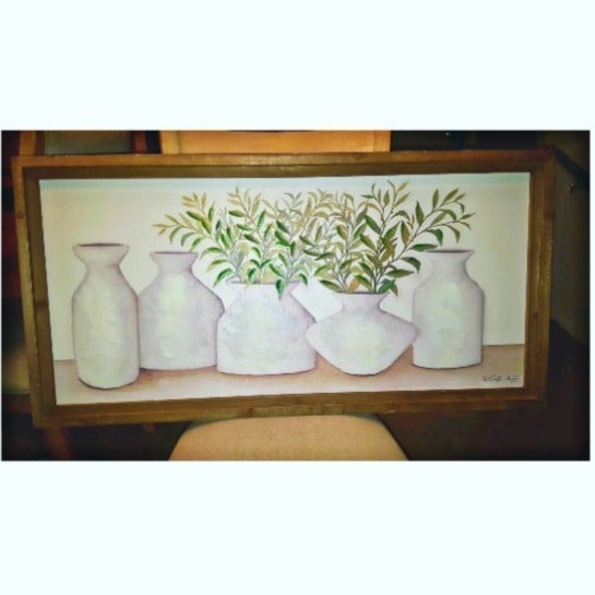 Rectangle Large wooden framed greenleaf vase painting by Cindy Jacobs. This art piece is painted with warm tones that make you feel like you were part of the painting itself. The vases are painted in what looks like 3D and the neutral tones go with any decor or color theme you love. This lovely piece can be placed above the fireplace, above your buffet table in the dining area or even your favorite room just for you.