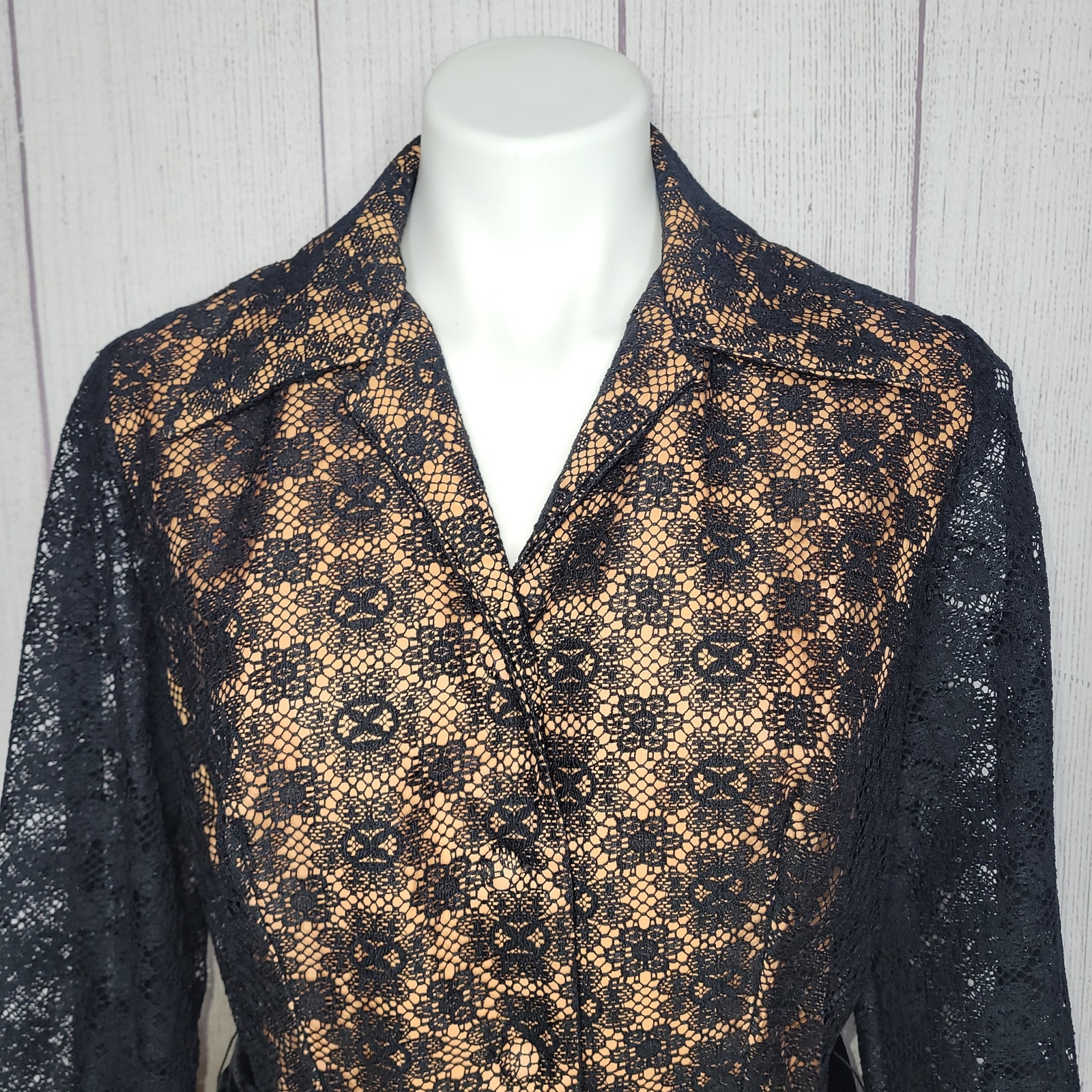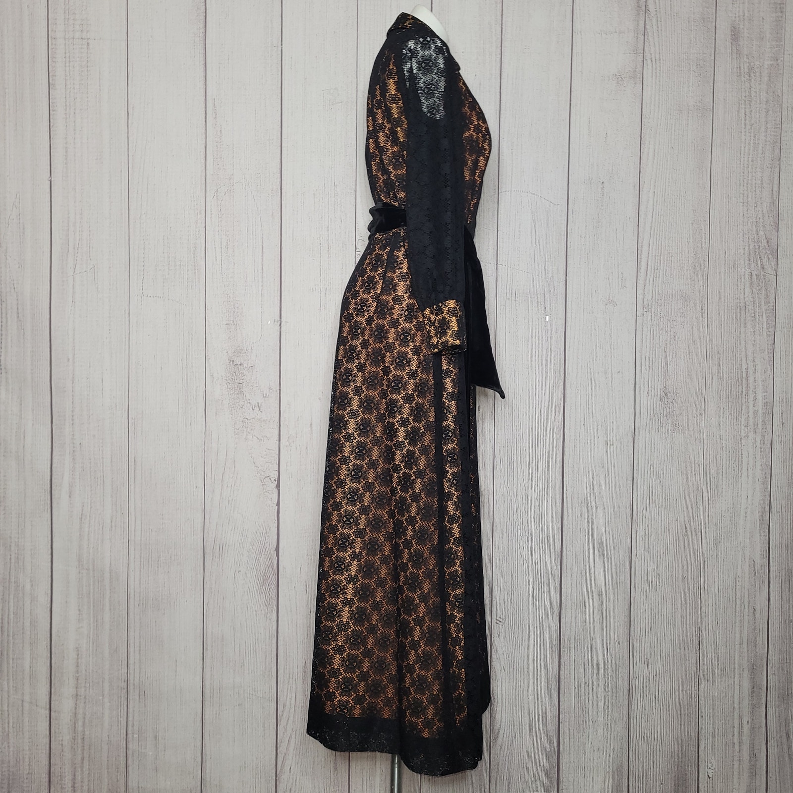 Vintage 70s Belted Black Lace V Neck Maxi Dress With Peach Underlayment