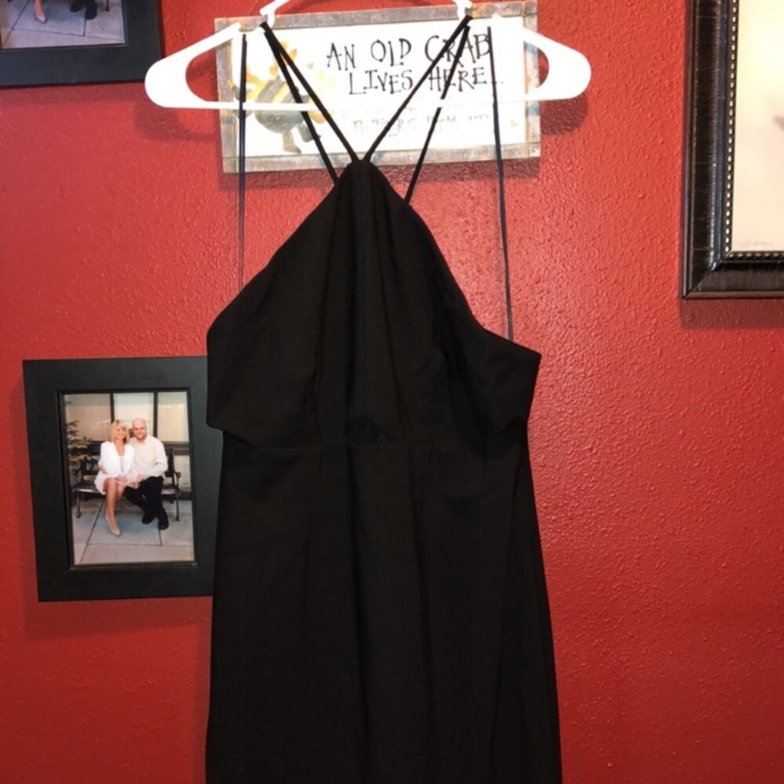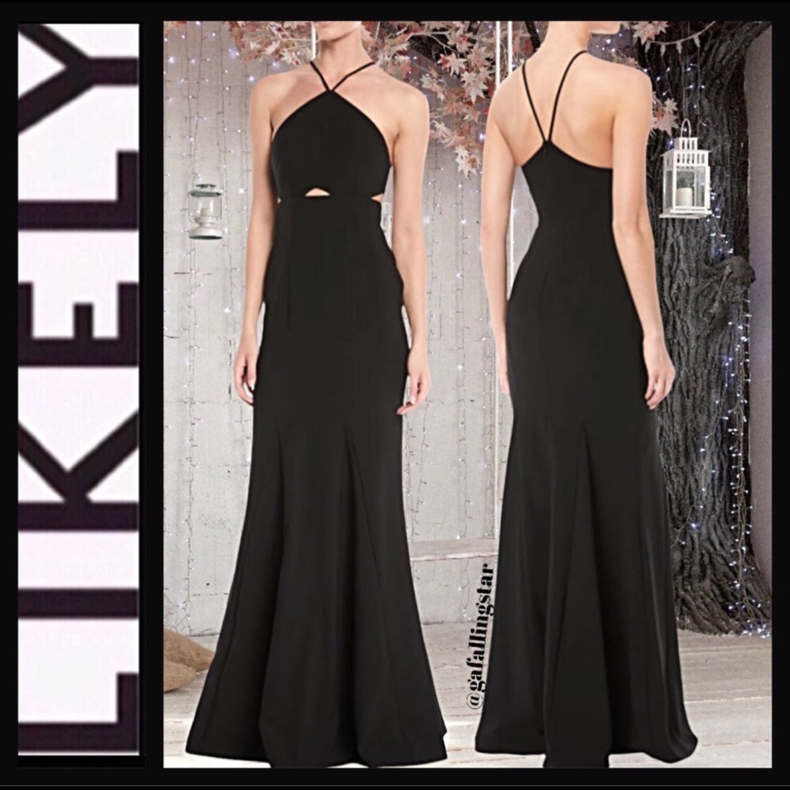 Stretch halter gown with subtle cut-out details at waist and sides.