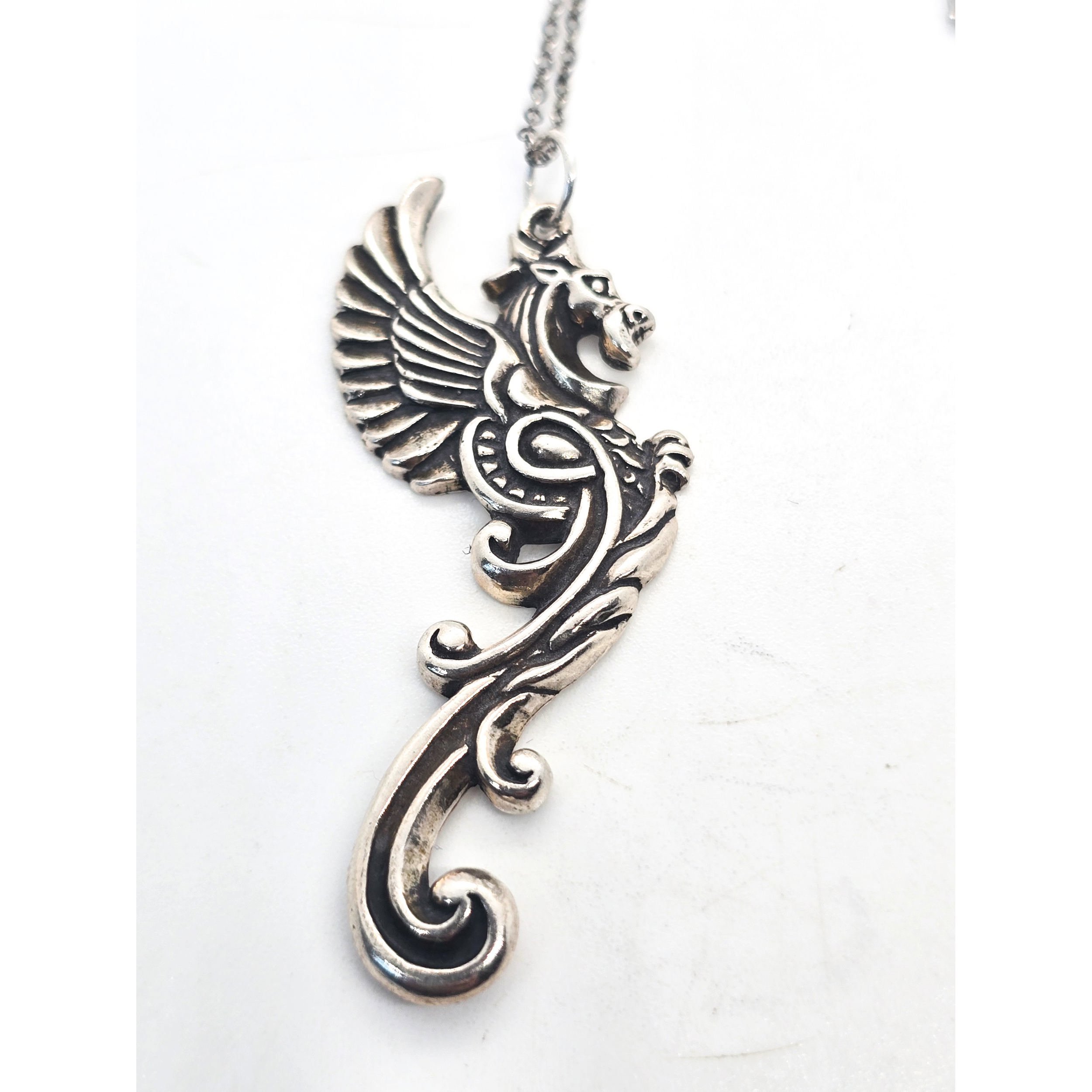 Tribal dragon large winged sterling silver pendant necklace. Good used condition with little to no signs of normal wear. Great patina present. Stamped 925 on the back. Comes with sterling silver chain.