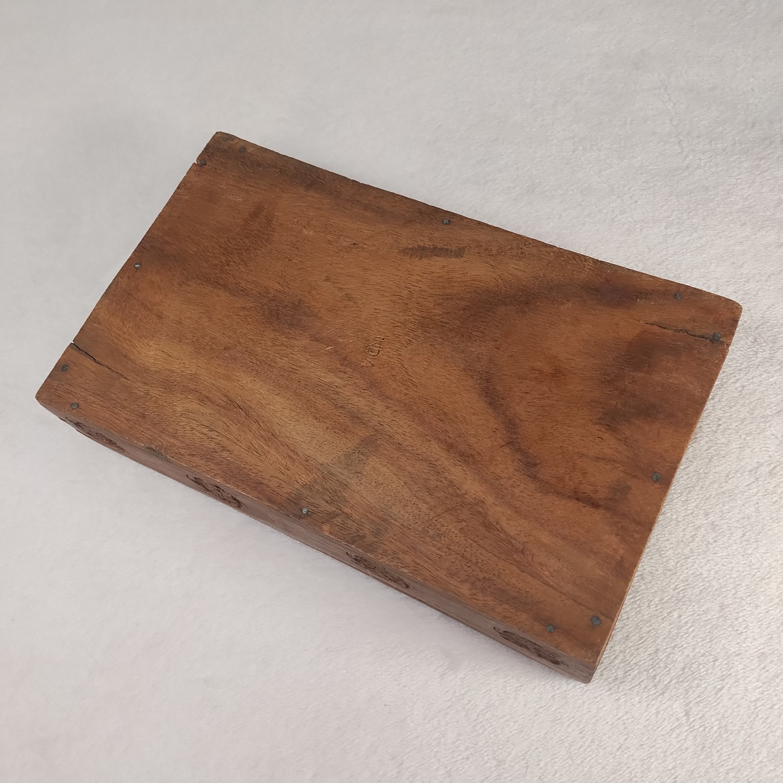 vintage 70s hand carved wooden box with blue felt interior. made in india.