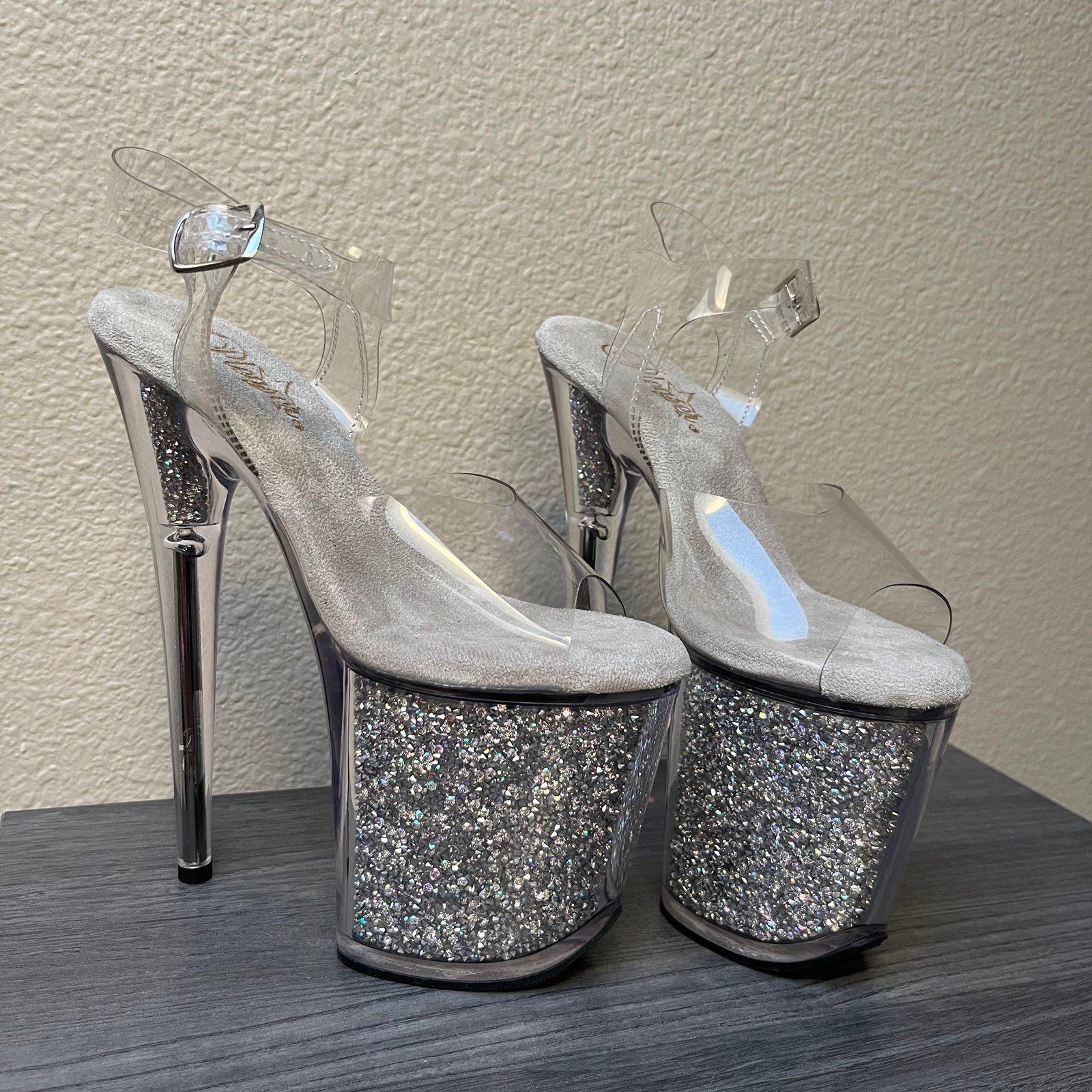 Stunning, sexy silver glitter platform heels with clear straps. Perfect for performers, costumes, or pole fitness.