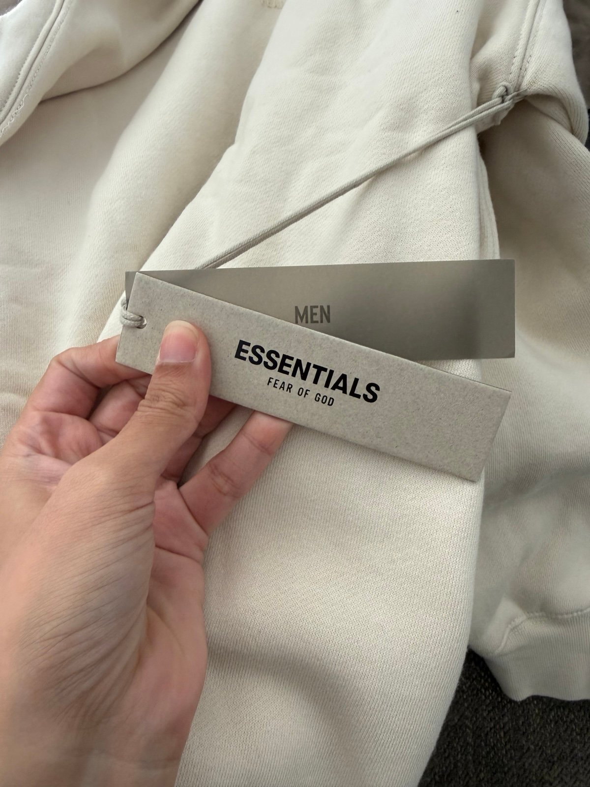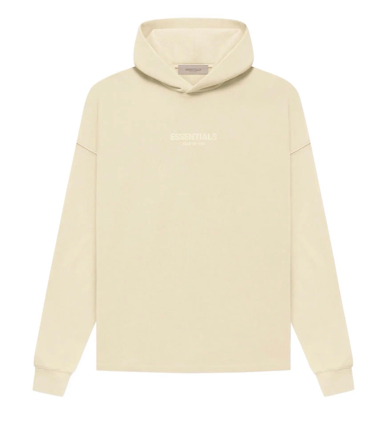 The Fear of God Essentials Relaxed Hoodie 'Egg Shell' from FW22 embodies the brand's understated, minimalist aesthetic. Constructed from cotton-blend fabric with fleece backing, the piece is rendered in a cream colorway and features a logo embroidery in off-white lettering across the chest. The brand's signature rubber logo patch lands on the back of the neck.