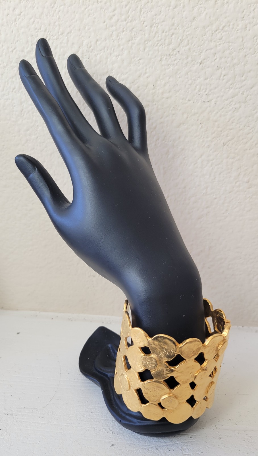 Add a touch of elegance to your outfit with this beautiful Kenneth Jay Lane Think Coin Satin Gold Cuff Bracelet. This hinged bracelet features a round shape with a toggle closure and is perfect for special occasions such as weddings, anniversaries, birthdays, or engagements. The bracelet is made of multi-tone gold plated metal and has a vintage feel that will complement any outfit.