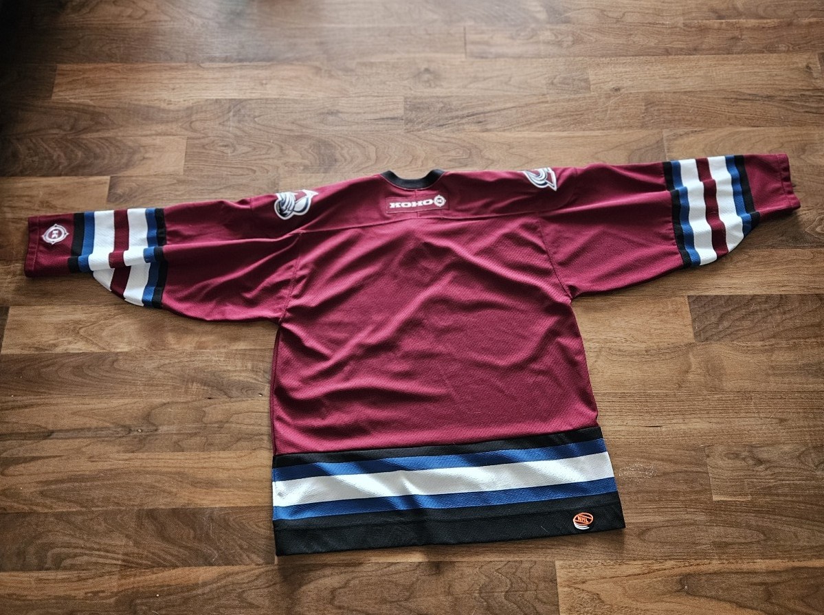 Show your support for the Colorado Avalanche with this vintage Koho jersey. Made in Canada, this officially licensed NHL hockey jersey features the team's maroon color and the iconic diagonal logo. The size is a men's XL and it is perfect for fans of the sport, especially those who love the Stanley Cup. This jersey is a great addition to any collection of fan apparel and souvenirs. Get ready to cheer on your favorite team in style! Please examine pictures for best description. Happy to answer any questions or to bundle. Thanks for looking.