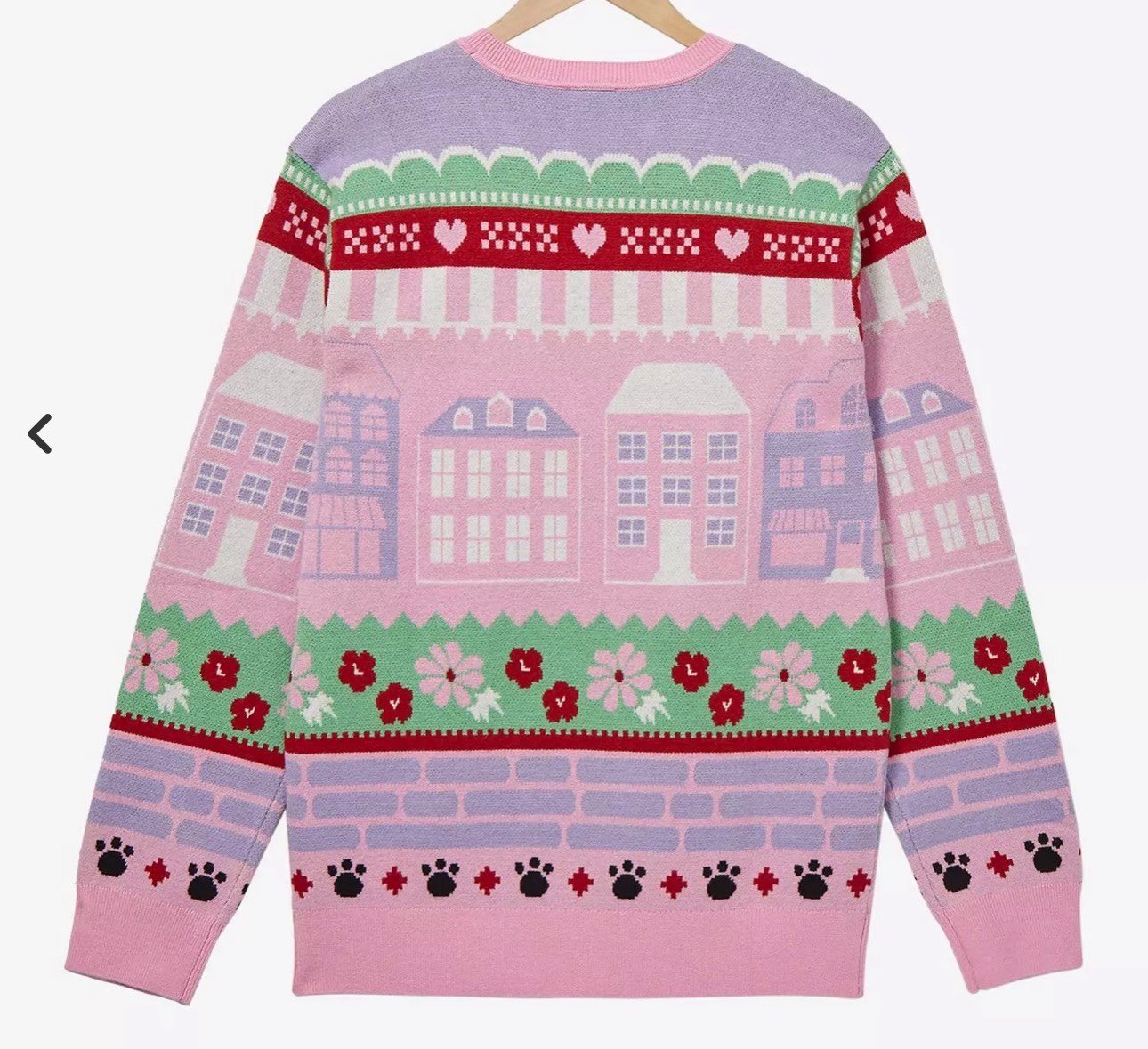 Jiji is ready to join your holiday wardrobe with this Kiki's Delivery Service-inspired sweater! Featuring a portrait of Jiji among flower and house details, this sweater includes crochet flower appliques. With repeating heart and paw print patterns along the top and bottom, this sweater is perfect for adding some Studio Ghibli style to your look.