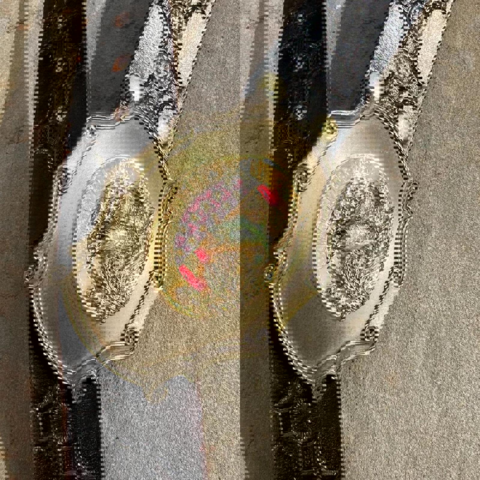 Large Mouth Bass American Flag ornate design large buckle, black embossed pattern leather belt