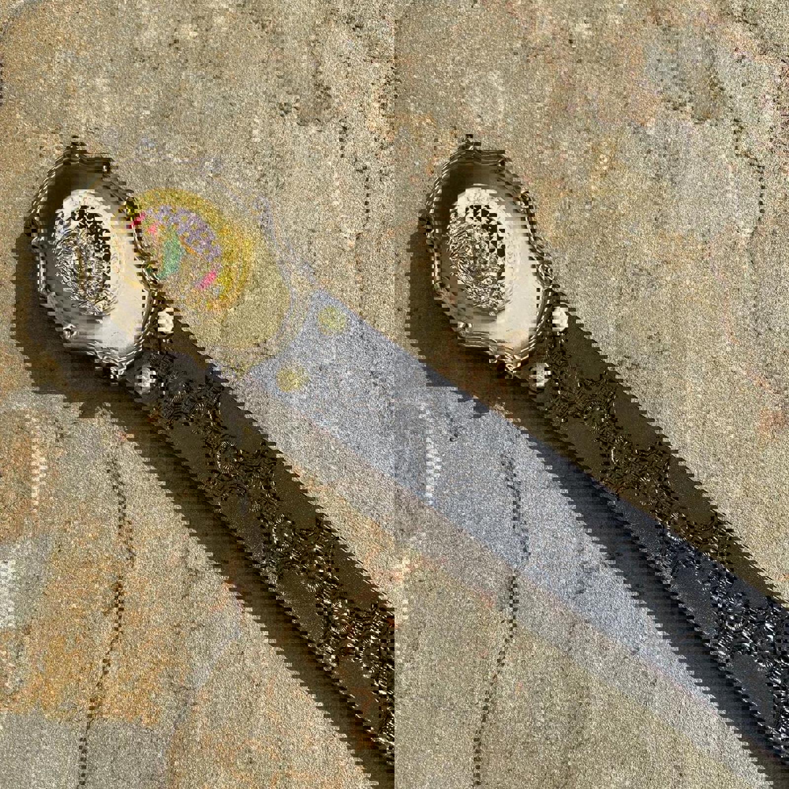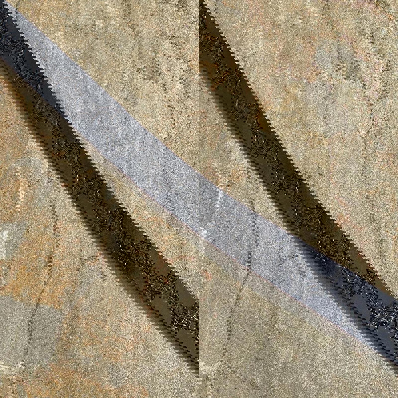Vintage 70s Fishing Buckle Embossed Pattern Black Leather Belt