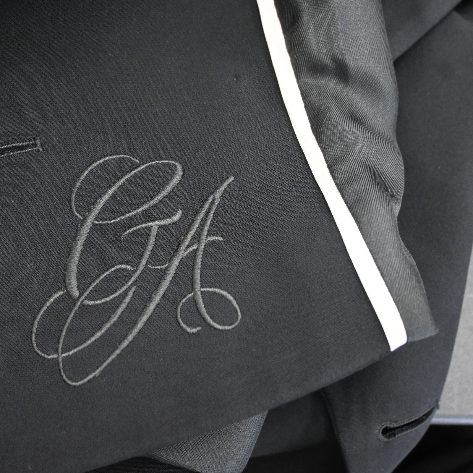 Condition is Pre-Owned. There are thread pulls and snags in the material on the left shoulder, left lapel, right arm and back of the jacket. There are also light dust marks on the back of the jacket.