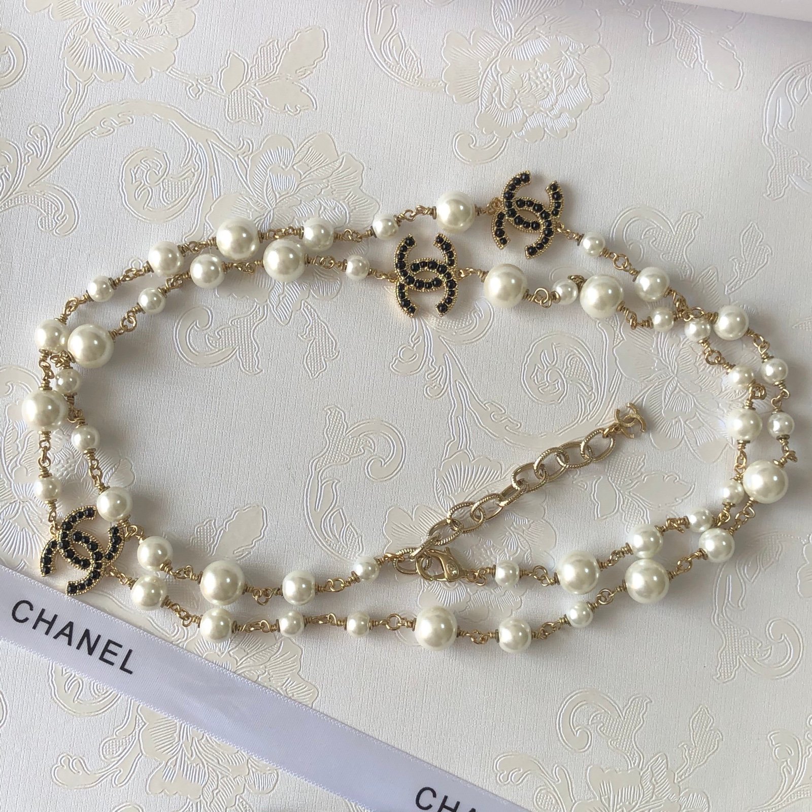 Crafted to perfection, it features lustrous pearls and sleek black crystals set against a backdrop of luxurious gold.