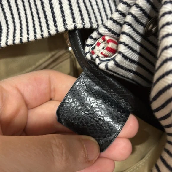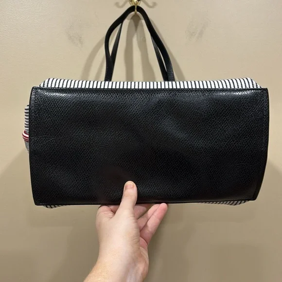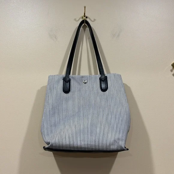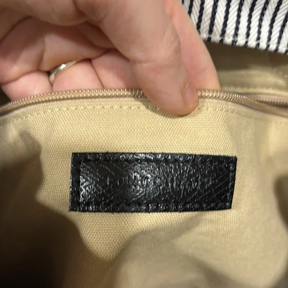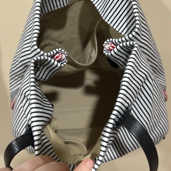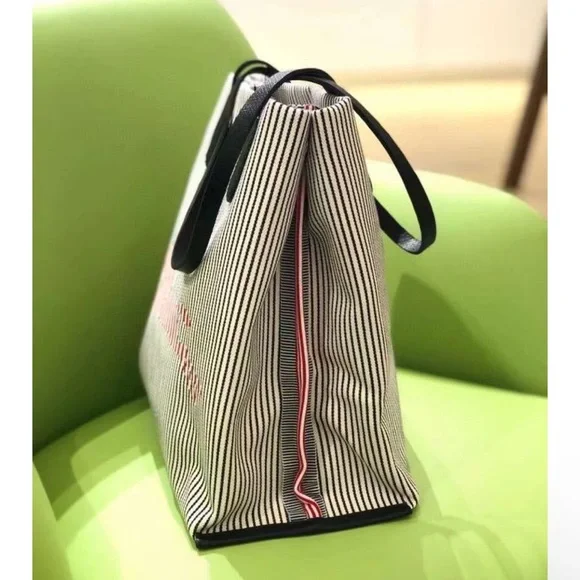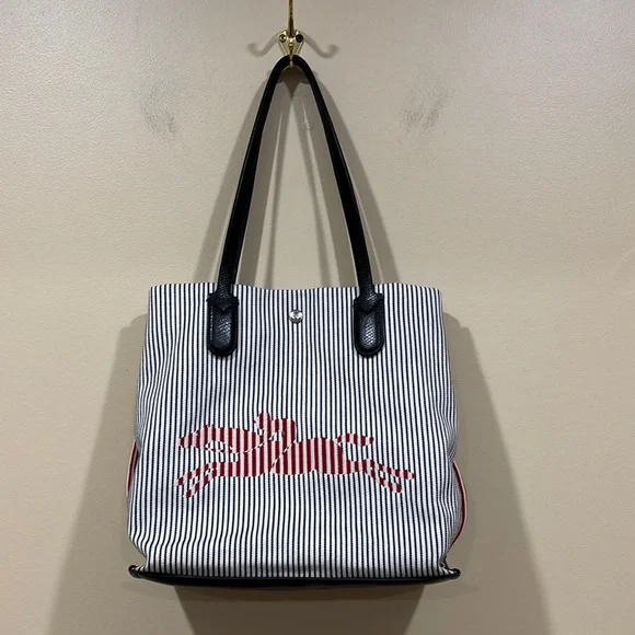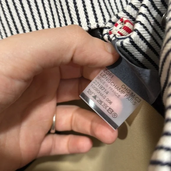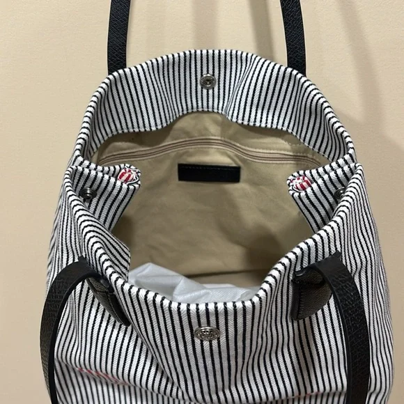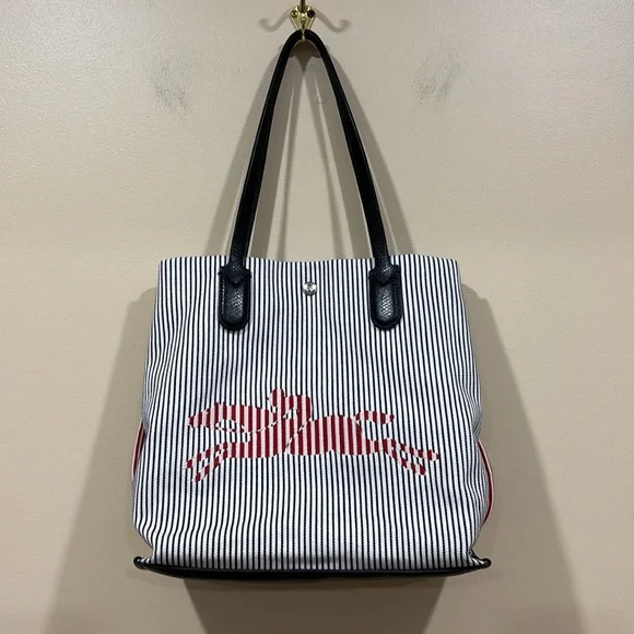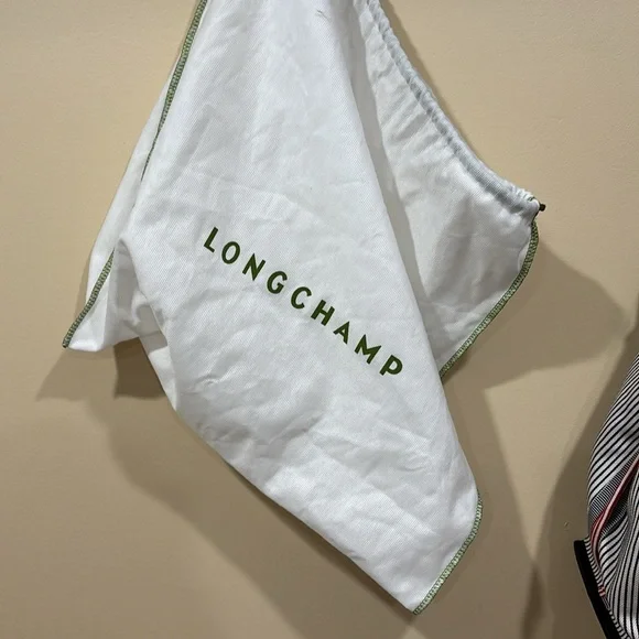 Longchamp Roseau Essential Rayé Medium Cotton Shopping BagStripedSilver-Tone HardwareLeather TrimFlat Handles & Dual Shoulder StrapsLeather Trim EmbellishmentSnap Closure at TopTop handlesDimensions: 12.6"W x 6.7"D x 12.6"HSnap closureTwo interior zip pockets, two slip pockets & pen pocketLogo printLined100% cottonImportedGreat pre worn condition. Comes with dust bagTags:Longchamp, longchamp bag, longchamp tote, tote bag, canvas, canvas tote, designer, designer bag, shoulder bag, leather, minimalist, contemporary, French designer, Paris, travel, on trend, trendy bag, purse, handbag, designer handbag, versatile, spacious*minimal packaging