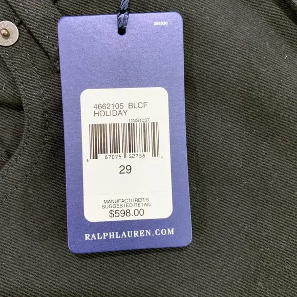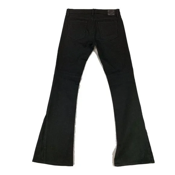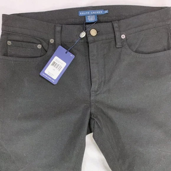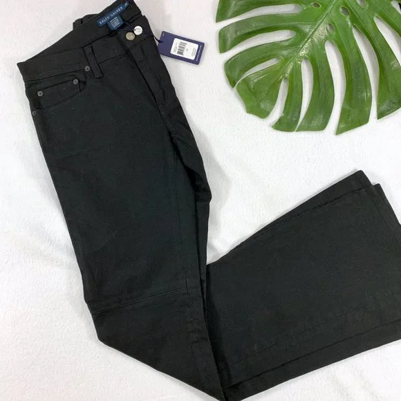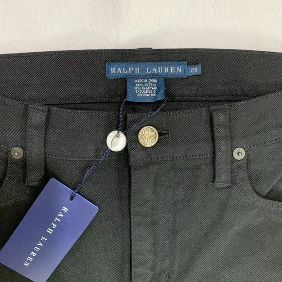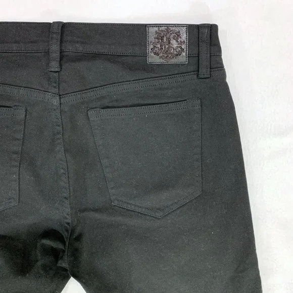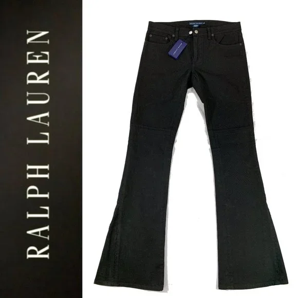 Treat yourself to these beautiful & stylish Ralph Lauren Collection solid black designer brand jeans. These luxury jeans feature subtle, classy details including a hem above the knee and intentionally slightly fringed triangular hems on the sides (see close-up photos). Slight flare to them. Size 29. New with tags. Measurements - all approximate:- 43” outseam- 34.5” inseam- 9” riseMaterial:- 98% cotton- 2% elastane4662105 BLCF Holiday398930