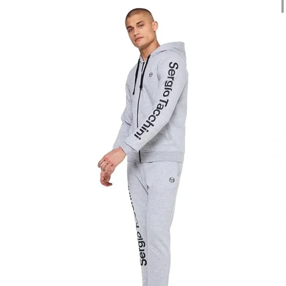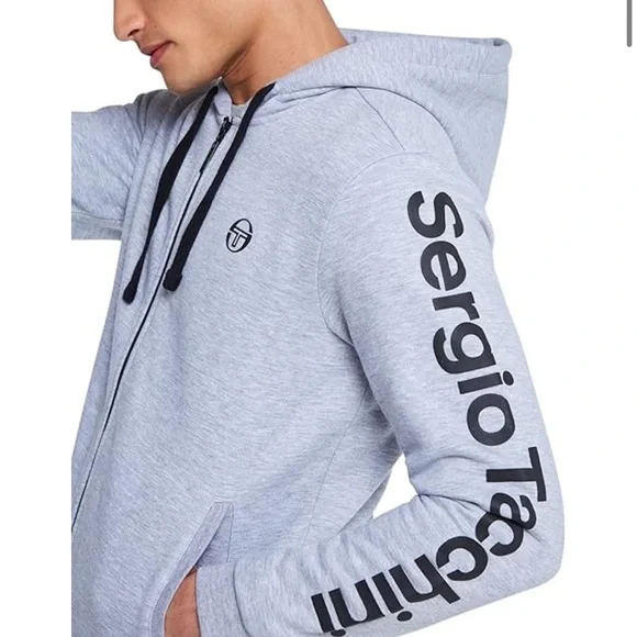 Stylish gray hoodie with a zip-up front. Features a hood and logo detail. Comfortable and casual.A Sergio Tacchini essential, the Namar Full-Zip Hoodie is made of super-soft brushed fleece cut with a full-zip front for easy layering. Equipped with a spacious hood and handwarmer pockets, the sweatshirt features our wordmark logo printed oversized down the left sleeve and an 'ST' monogram at the left chest.