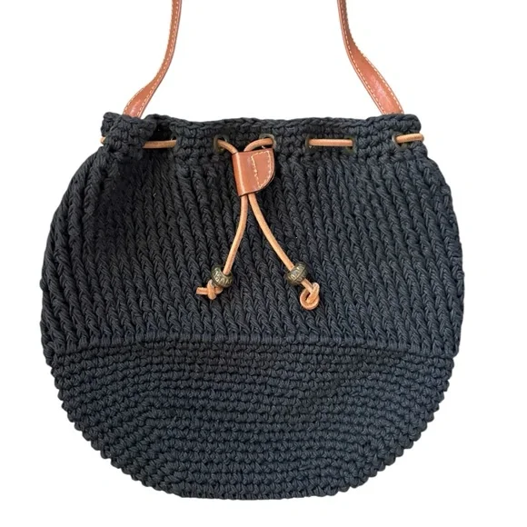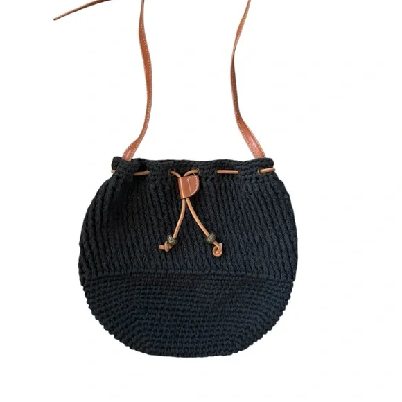 Nordstrom Made in Italy Black Woven Drawstring Bucket Crossbody BagExcellent conditionThis stylish crossbody bag from Nordstrom showcases a unique woven texture in black, paired with elegant tan leather accents. Its adjustable strap and compact design make it an ideal choice for casual outings. The round shape adds a touch of bohemian charm to your look.Leather drawstring closureAdjustable leather shoulder strapShoulder drop: 22"One zipper interior pocketMade in Italy