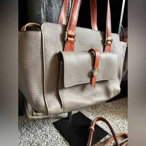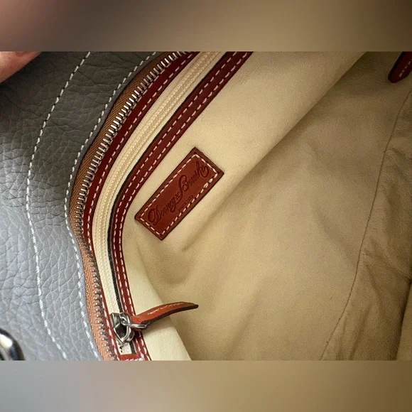 Dooney & Bourke New Cambridge Shopper ToteGenuine pebbled leather- GreySilver tone hardwareRetail $328UNIQUE RARE LEATHER INTERIOR.Outside front large pocket Zipper closureMeasures 8" height, 14" width, 5" depthInterior slip pocket and a zipper pocketDetachable strap with a 23 adjustable and removable strapKey clipMissing orig tassels Smoke free home.No call outs, no rips tears or stains. Please see allPhotos for condition. 100% AUTHENTIC. COA available upon request for $30