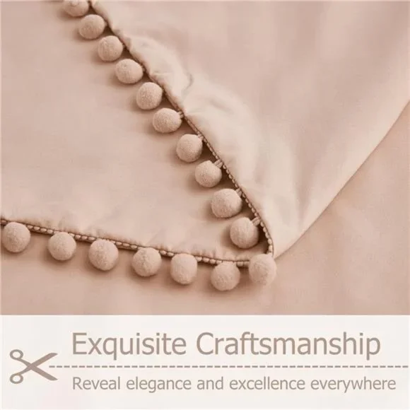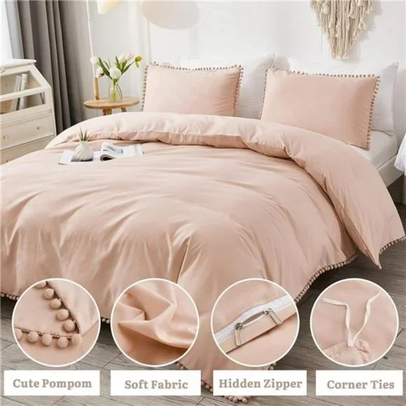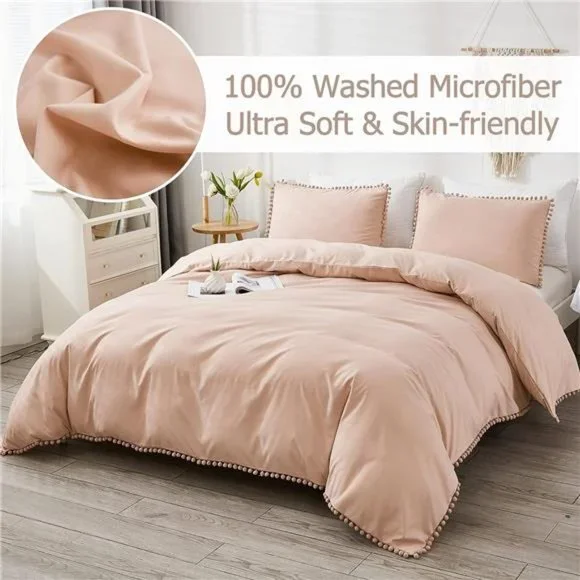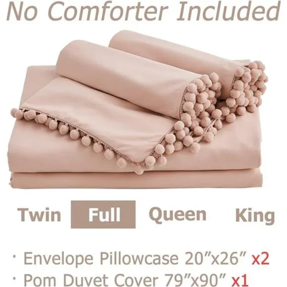 🧿[POM FRINGE DESIGN] The handmade pompoms add a unique sense of refinement to this cute duvet cover. With the selected color, this pom duvet cover is brought to life with vitality. Minimalist patterns and exquisite craftsmanship, particularly beautiful and harmonious, bring you a pleasant mood and unlimited visual enjoyment. The ball fringe duvet cover set is a great gift choice for your loves, boys, girls, and kids.🧿[ULTRA SOFT & COMFORTABLE] Made of washed microfiber fabric, this lightweight duvet cover has good air permeability and will be warmer and softer after cleaning. Superb yarn-dyed sewing ensures its fade-resistant and durable quality. After a day of hard work, a super soft duvet cover can help you recover your whole body from tiredness, you can immerse yourself in dreams with this cozy duvet cover all night. This comfy duvet cover has no smell, even better if you sleep naked.🧿[HIDDEN ZIPPER & CORNER TIES] The hidden zipper closure is more convenient and beautiful than other closures. We have a flap to cover the zipper closure so that it is invisible and durable, making no noises during moving. At the same time, 4 corner ties inside your duvet cover can help secure comforter in the right place from slipping into a pile and keep you comfortable all night long.🧿[WHAT YOU CAN RECEIVE] FULL SIZE DUVET COVER SET: 2 envelope pillowcases (20x26 inch), 1 zipper duvet cover full(79x90 inch). *Note that pillow insert, comforter, or duvet insert is Not included.