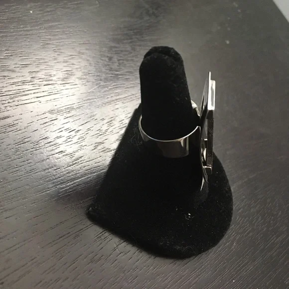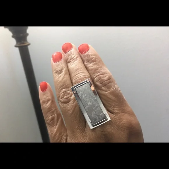 From Muonionalusta Artic Circle, Sweden A Innovative, Large 100% Natural Meteorite Curved Center Ring Sz 7. 925 Silver, Treated with special coating or PVD plating to avoid rusting. Unlike other stones, meteorite originates from outer space. Beautiful crystalline, formally known as “Widmanstatten Patterns” which is the biggest feature & unique to this meteorite type.These patterns can only form over millions of years of cooling & it has been estimated that it took about 1000 years for these molten pieces of planetary core to cool by just 1 degree Celsius. Muonionalusta is located north of the Arctic Circle in the northern part of Sweden & the first meteorite was found in 1906. It has been confirmed by geologists that meteorite had traveled through space for over four billion years before it was trapped by the Earth‘s gravitational field& pulled to Earth as a brilliant fireball. Makes a Perfect Unique Gift for that Special Lady! Not Available in USA. Box not included Meteoright Brand